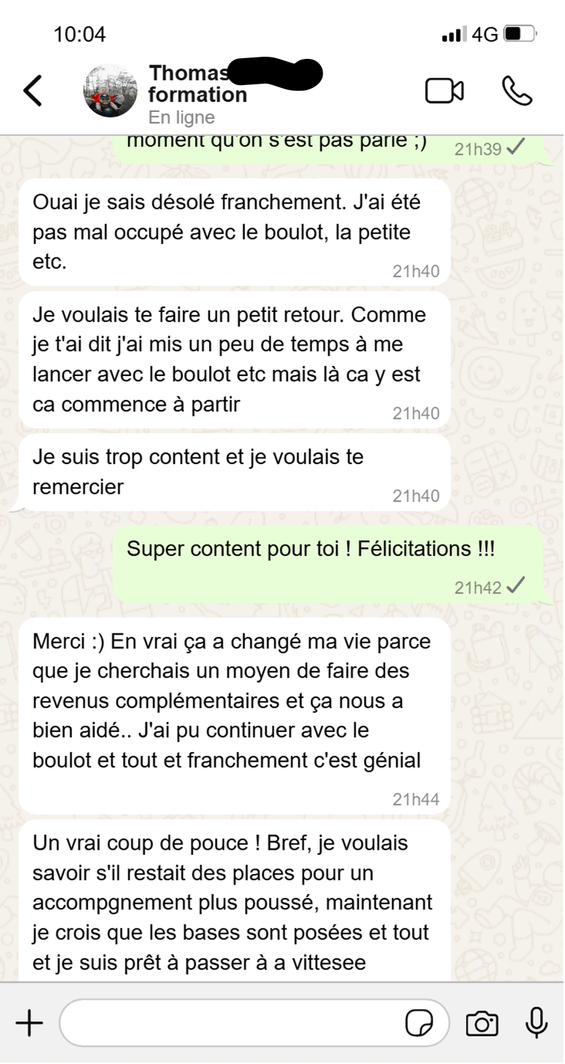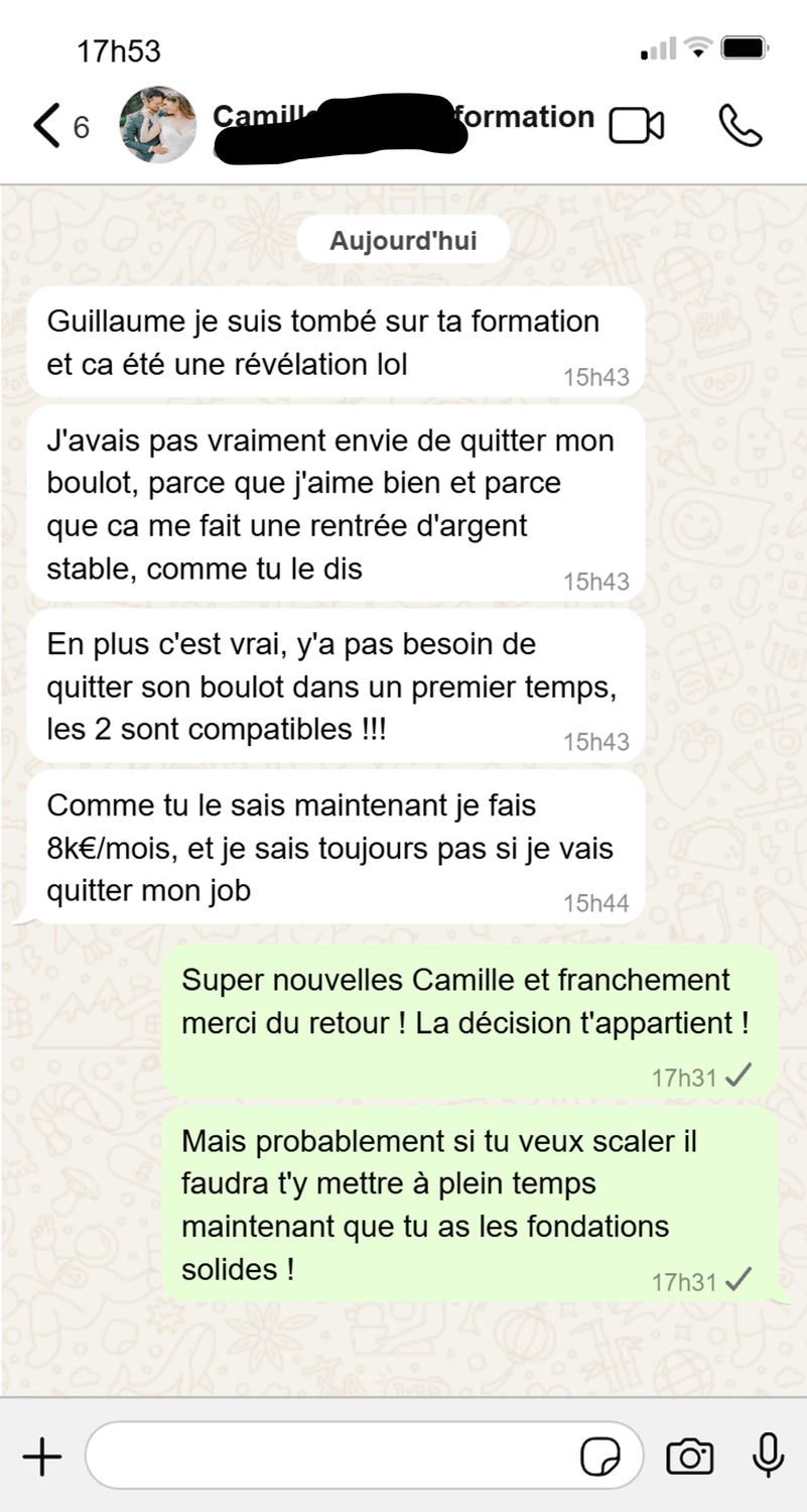 Alors j'ai décidé de me lancer. Avec un système éprouvé. Un système qui marche parce que plusieurs de mes clients ont réussi à changer de vie. D'autres ont fait le choix de garder leur boulot mais de poursuivre leur activité à côté, par hobby ou passion, et de gagner jusqu'à 15k€ par mois supplémentaires.